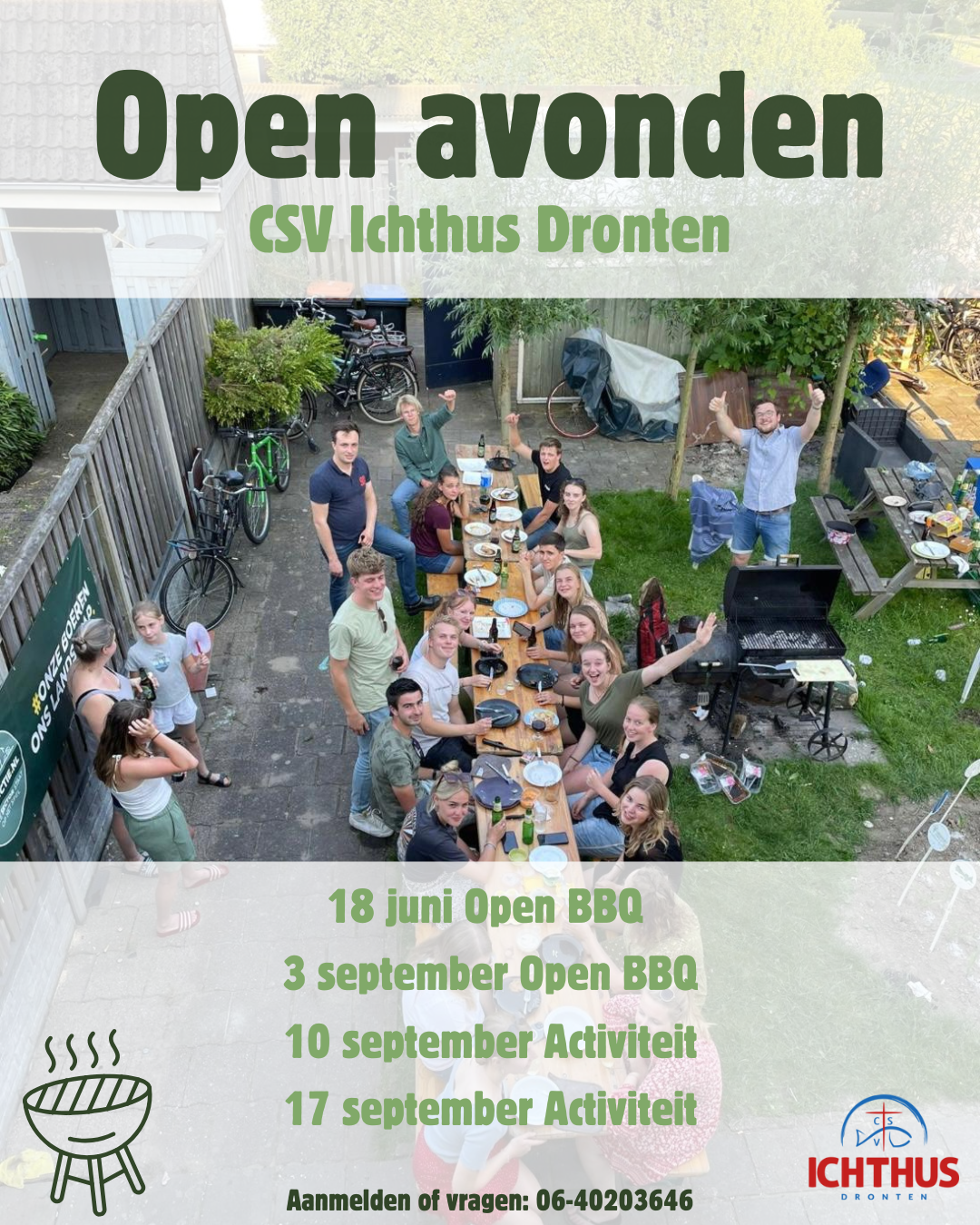 Lijkt het je leuk om Ichthus beter te leren kennen, kom dan op onze open BBQ op 11 september, of bij onze open activiteit of Bijbelstudie op 18 en 25 september!